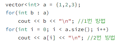 범위기반 for 루프 : c++ 11부터 범위기반 for 루프를 사용할 수 있으며, vector 내의 있는 요소들을 쉽게 순회할 수 있다.