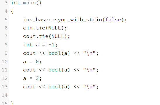 참고로 c++에서는 0이면 false, 0이 아닌 값들은 모두 true가 되며 bool()을 통해 간단하게 bool형으로 형변화이 가능하다.